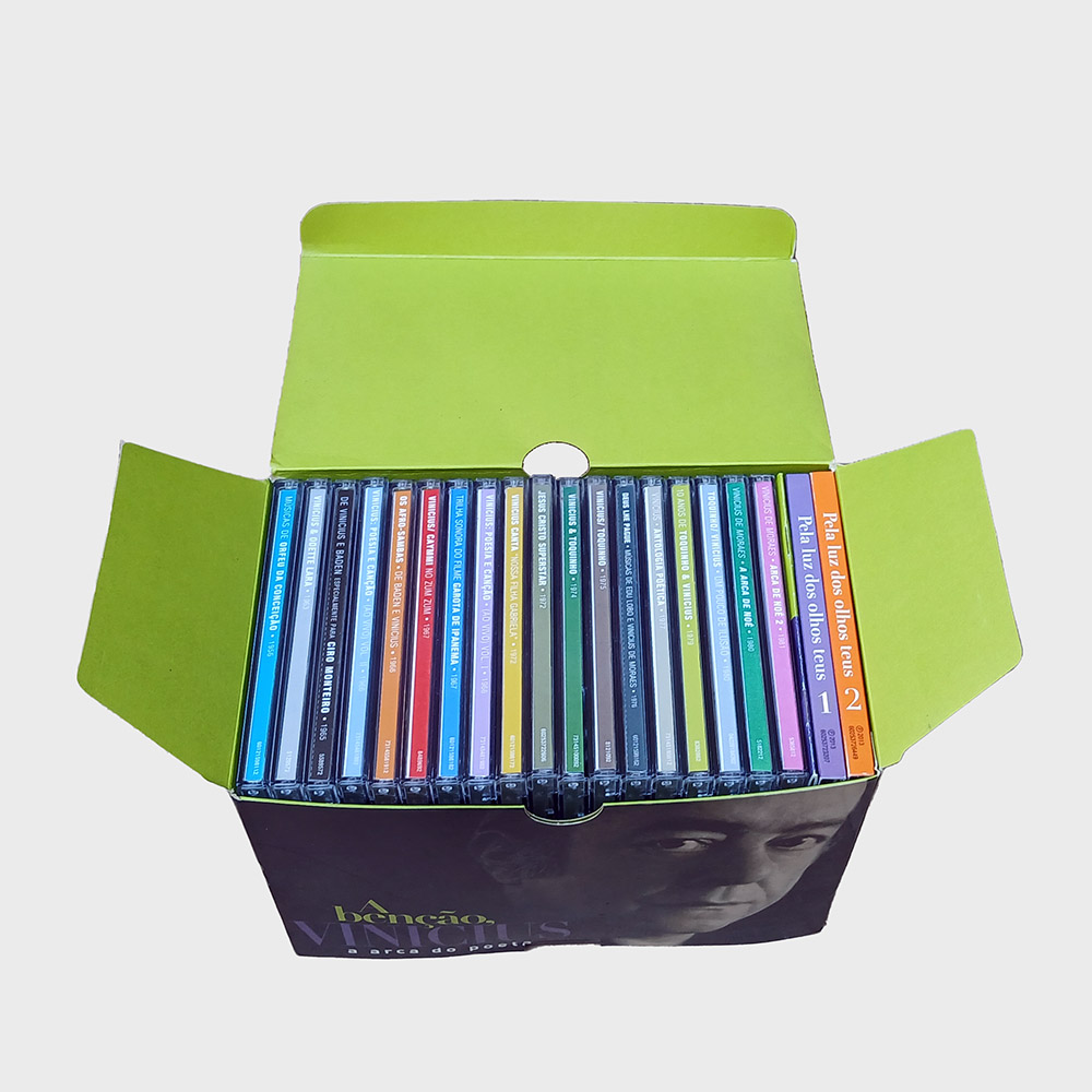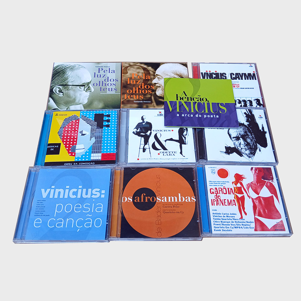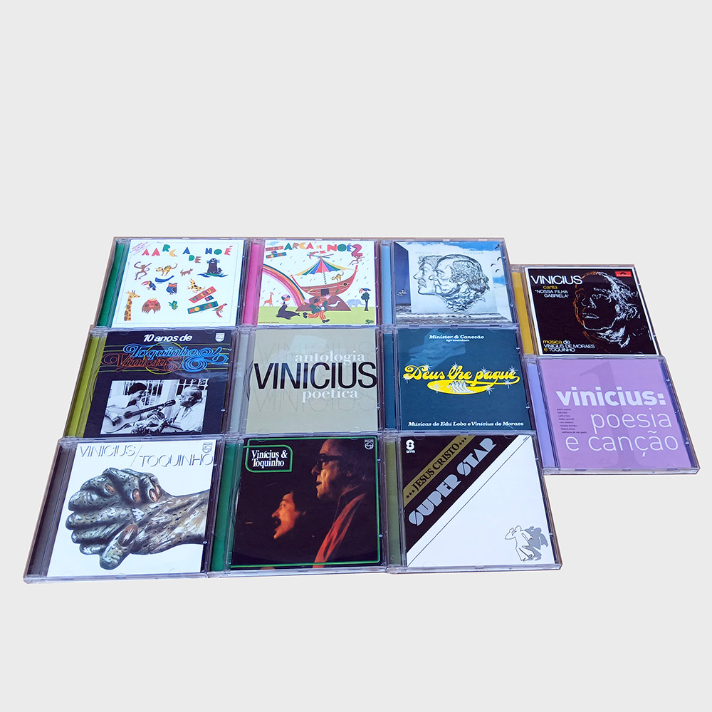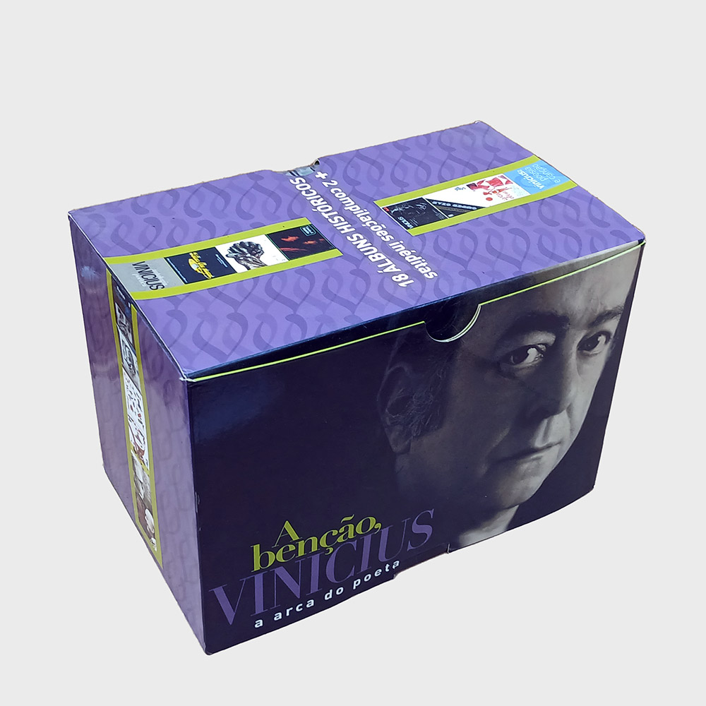Caixa com 20 CDs, sendo dezoito álbuns de estúdio mais duas compilações inéditas contemplando a carreira de Vinicius de Moraes na Universal. Produto usado em perfeito estado,  tanto encartes como mídias, apenas a caixa externa com poucas marcas.